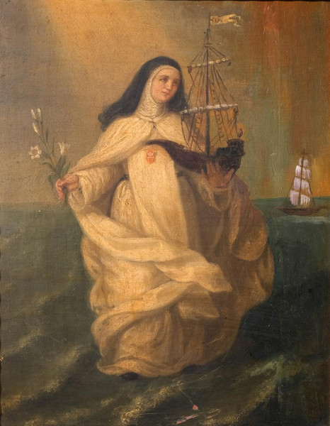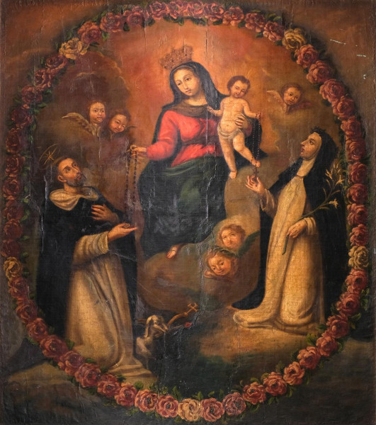 Virgen del Rosario con Santo Domingo de Guzmán y Santa Catalina de Siena en orla de flores