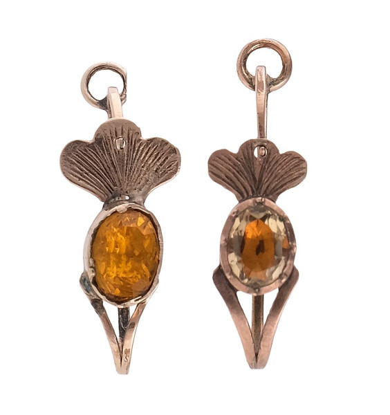 Pendientes en oro amarillo de 9k con hojilla y vidrio sobre talco amarillo de talla oval. Peso total de las piezas: 2,1g.