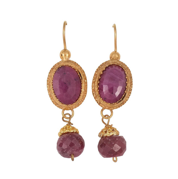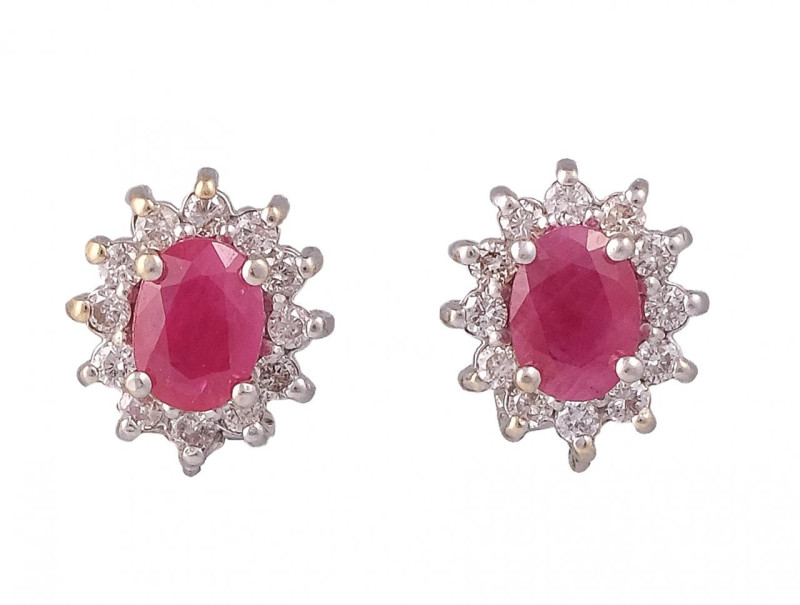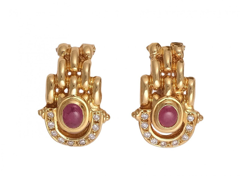 Pendientes en oro amarillo de 18k con brillantes y rubí central de 0,24ct. Cierre omega. Peso total de las piezas: 5,36g.