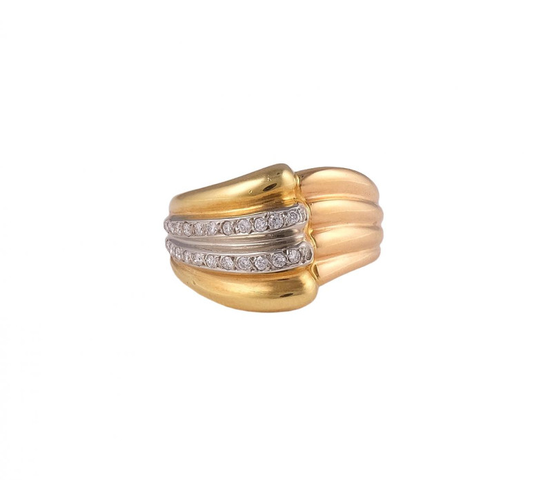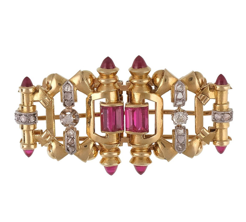 Broche de doble clip estilo Chevalier, años40, en oro de 14k, rubíes de 0,75ct y pequeños brillantes de 0,6ct. Medidas: 3 x 5cm. Peso total de la pieza: 18,59g.