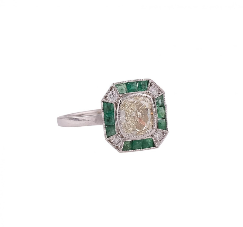 Anillo en estilo Art Déco en oro blanco de 18k, de forma octogonal con con diamante amarillo de 1ct aproximadamente con orla de esmeraldas de 0,15ct y diamantes de 0,10ct. Peso total de la pieza: 3,40g.