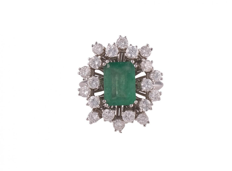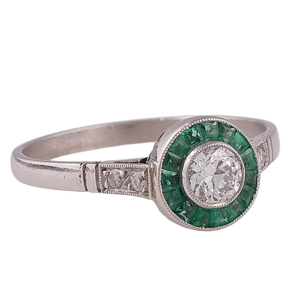 Anillo en oro blanco de 18k de estilo Art Déco con diamante talla brillante de 0,25ct y halo de esmeraldas de 0,12ct. Peso total de la pieza: 3,12g.