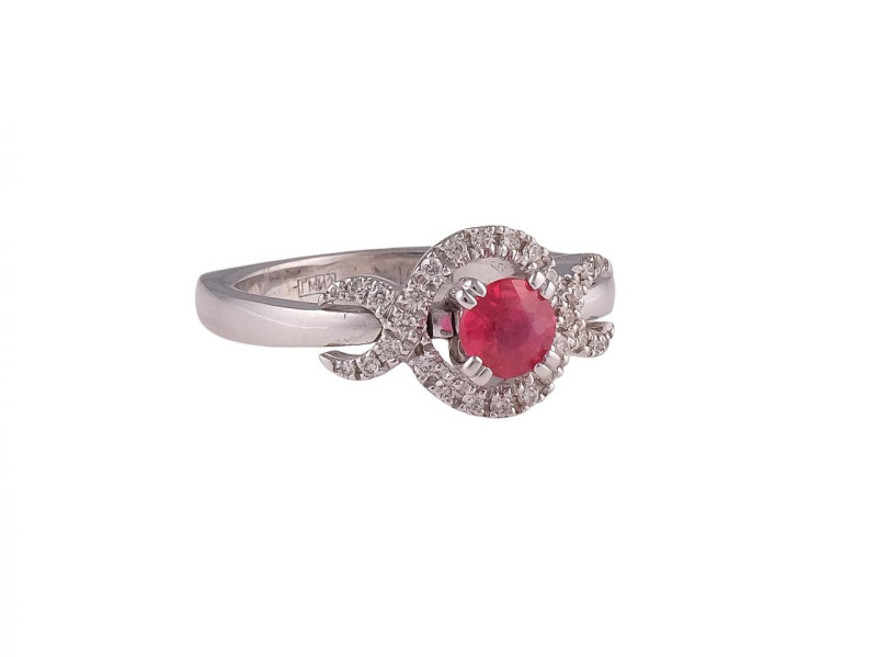 Sortija en oro blanco con rubí central de 0,65ct en talla brillante con orla de diamantes de 0,26ct. Peso total de la pieza: 6,53g.