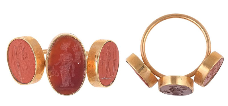 Anillo neoclásico del Grand Tour en oro amarillo de 18k con tres intaglios romanos. Fns. S. XVIII - Ppio. S. XIX.