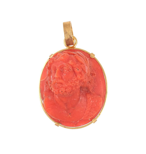 Colgante neoclásico del Grand Tour con montura en oro amarillo de 18k con esfigie del emperador Adriano en coral . S. XVIII - S. XIX.