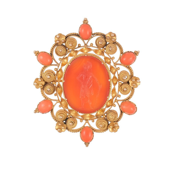 Broche neoclásico del Grand Tour con montura de filigrana con placas florales en oro amarillo de 18k con intaglio central en cornalina representando al dios Ares y seis cabujones de coral, (h. 1800). Peso total: 17,37g.