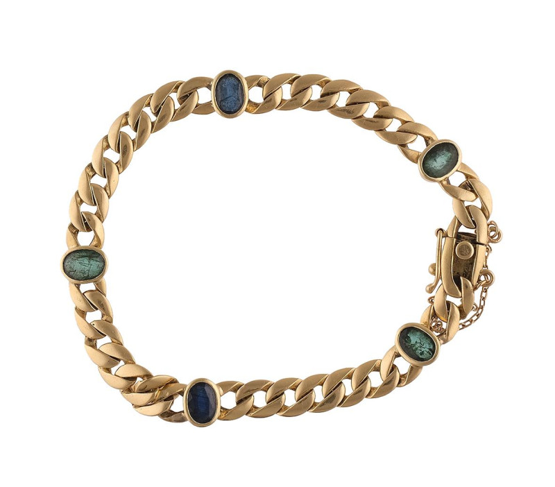 Pulsera de eslabón barbado en oro amarillo de 18k con tres esmeraldas en talla oval -peso estimado: 1,65ct- y pareja de zafiros en talla oval -peso estimado:1,85ct-. Cierre de cajetín. Peso total de la pieza: 17,9g.