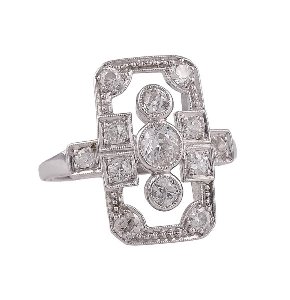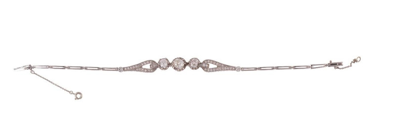 Pulsera de pedida Art Déco en platino con tres diamantes centrales talla brillante de 1,70ct totales y ornamentada con pequeños diamantes talla antigua. Largo total: 19cm. Peso total de la pieza: 14,65g.