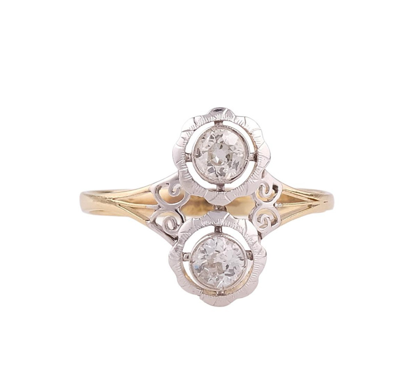 Anillo tú y yo en estilo Art Déco en oro amarillo de 18k con dos diamantes talla brillante de 0,20ct cada uno. Peso total de la pieza: 1,80g.