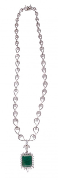 Gargantilla en oro blanco de 18k con diamantes talla marquise de 5,20ct con colgante de esmeralda de 7ct engastada a cuatro garras y orla de diamantes. Largo total: 39cm. Peso total de las piezas: 39,82g.