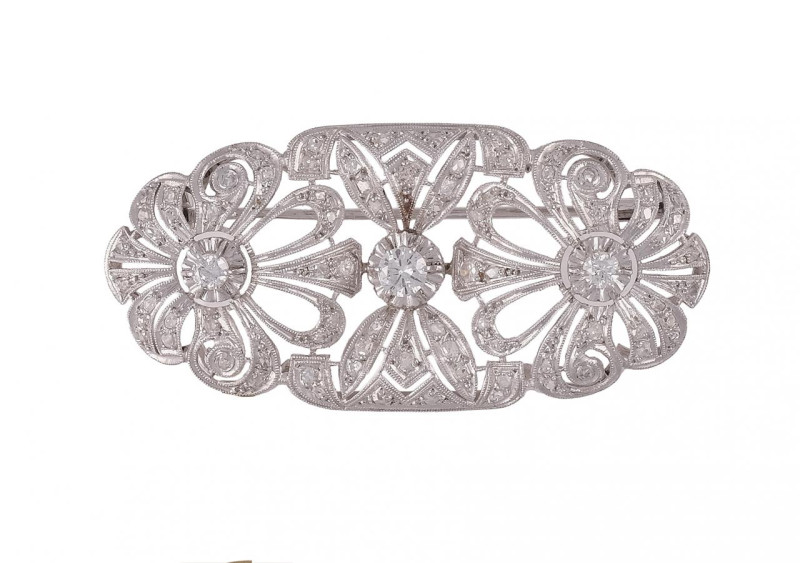 Broche conformado por tres flores en oro blanco ornamentado en los centros por brillantes de 0,70ct. Fechado hacia los años 30-40. Medidas: 2,5 x 6cm. Peso total de la pieza: 11,38g.