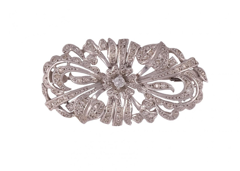 Broche de platino ornamentado con diamantes de 0,72ct. Medidas: 2,5 x 4,5cm. Peso total de la pieza:10,53g.