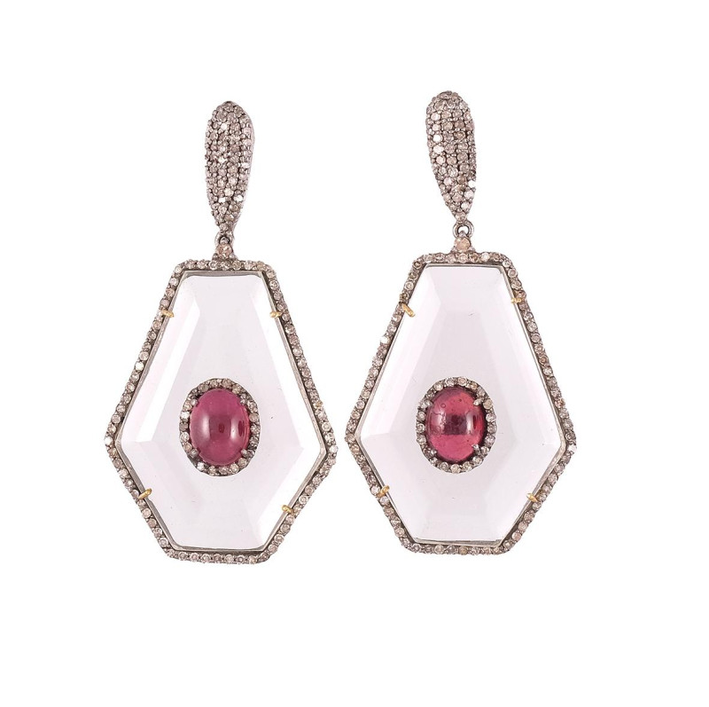 Pendientes de forma hexagonal en cuarzo con rubíes centrales 0,60ct cada uno y pequeños diamantes. Cierre a presión. Peso total de las piezas: 11,20g.