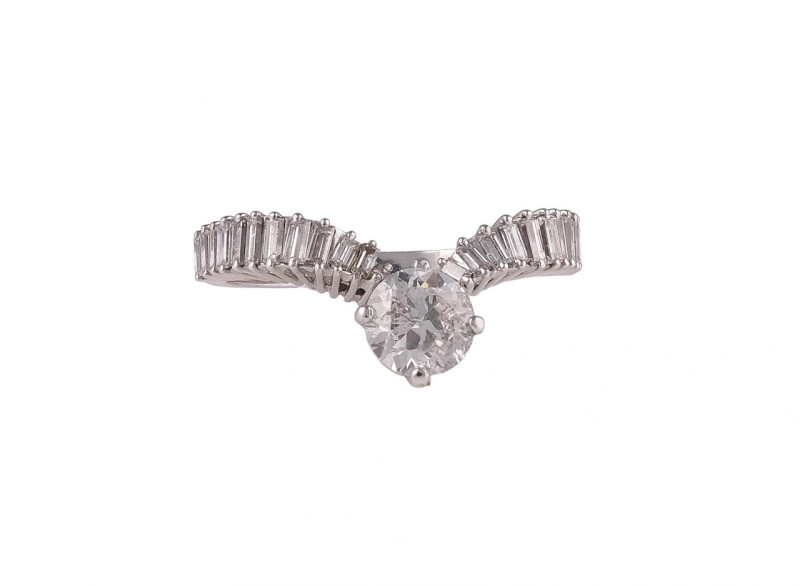 Sortija solitario con brazos de baguets gradual. Brillante central de 1ct, calidad pique, color H. Baguets de 1,10ct. Peso total de la pieza: 3,93g.