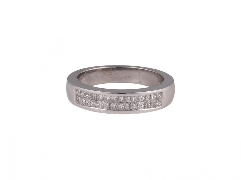 Media alianza de diamantes princesa doble de 0,90ct. Peso total de la pieza: 6,13g.