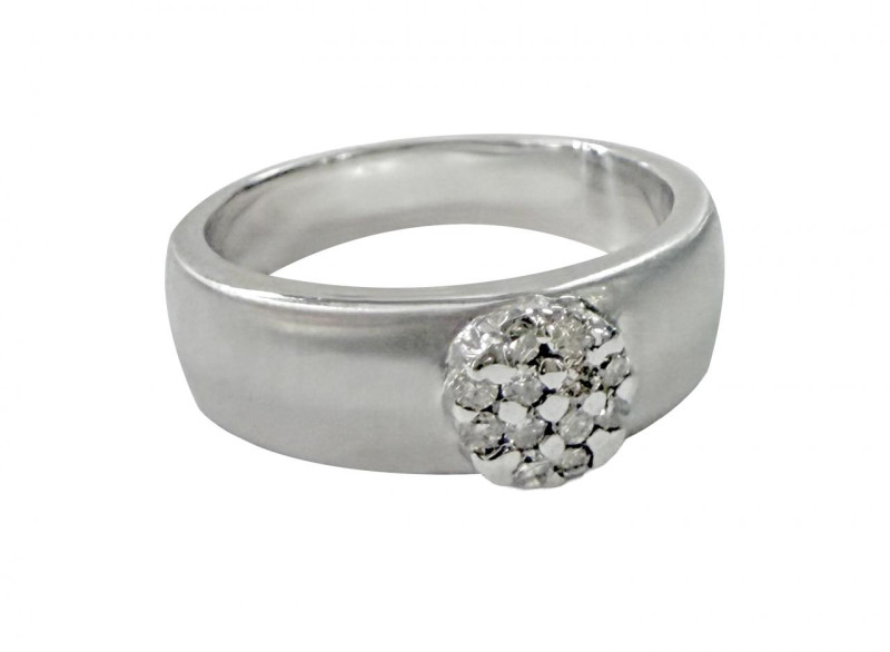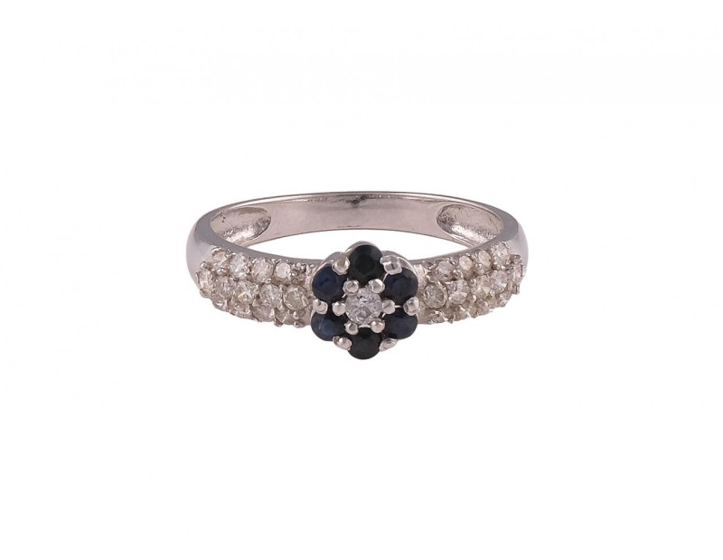 Sortija de oro blanco con roseta central de brillantes y zafiros de 0,48ct. Peso total de la pieza: 2,85g.