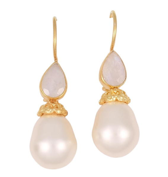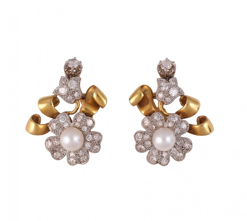 Pendientes en forma de flor con frente de platino y trasera en oro amarillo de 18k ornamentados con diamantes talla 8/8 de roca antigua con un peso total estimado de 1,64ct, perlas cultivadas Akoya de 6mm de diámetro.