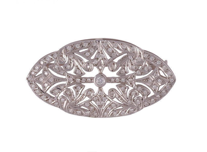 Broche en oro blanco de 18k ornamentado con brillantes de 0,18ct, siendo el central de 1,55ct. Medidas: 3,5 x 6cm. Peso total de la pieza: 20,15g.