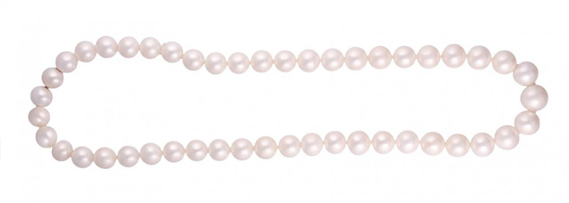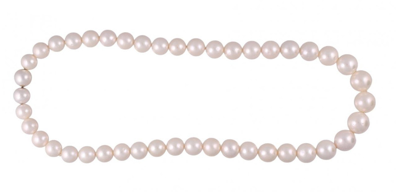 Collar de perlas semiredondas en disminución de 14 a 11,5mm de diámetro. Cierre oculto. Largo total de la pieza: 58cm.
