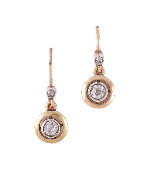 Pendientes circulares de oro amarillo de 18k en estilo Art Déco de oro y diamante central de 0,44ct. Cierre ballestina. Peso total de las piezas: 4,18g.