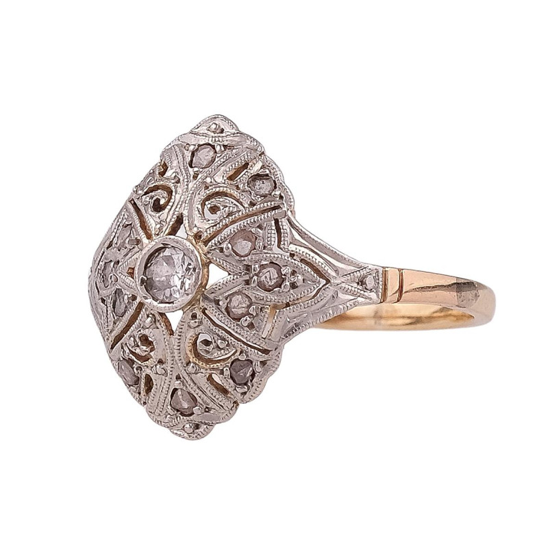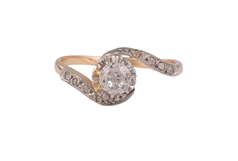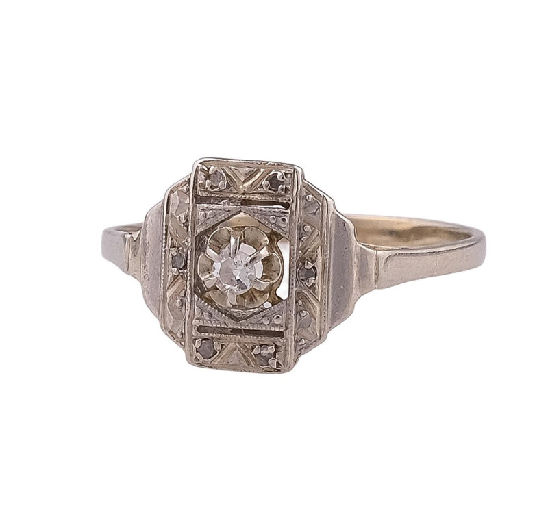 Anillo en estilo Art Déco en oro amarillo con diamante central de 0,04ct. Peso total: 2,88g.