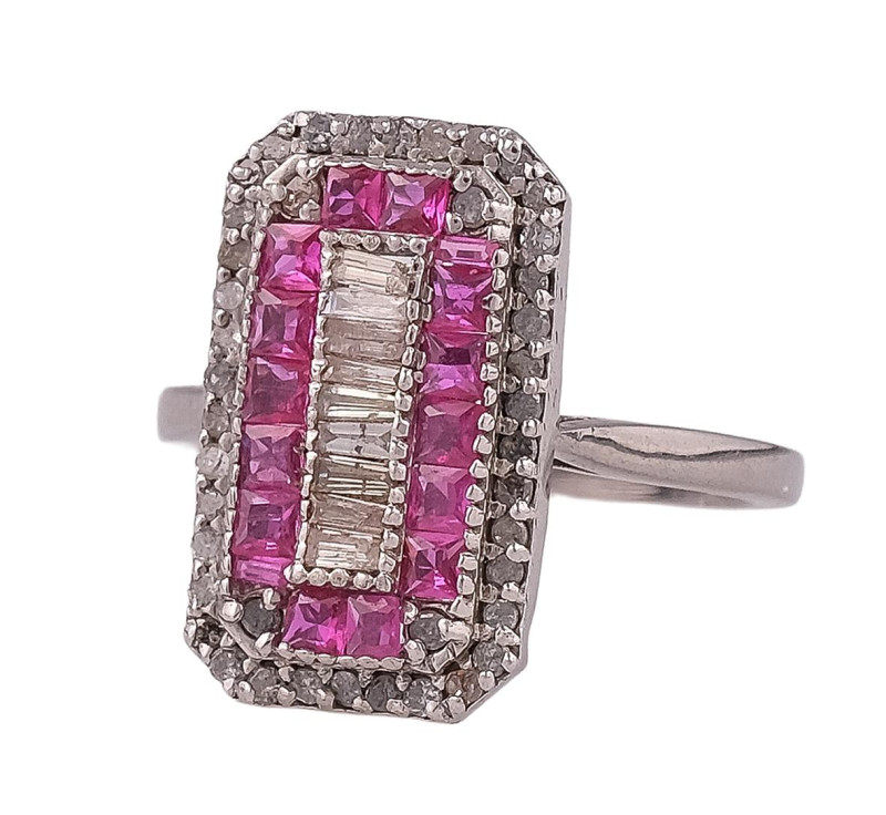 Anillo estilo Navette en oro blanco bajo con rubíes sintéticos y marcasitas. Peso total de la pieza: 4,24g.