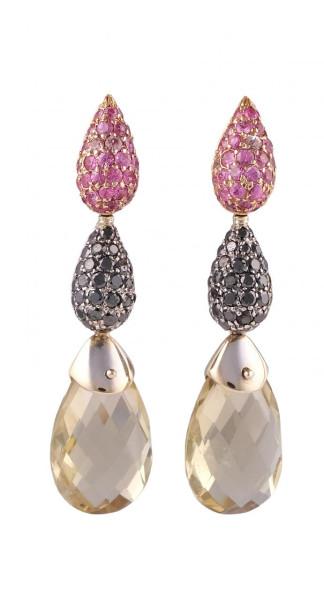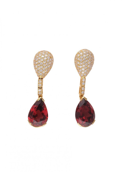 Pendientes en oro blanco con baño de oro amarillo, brillantes y granates de 8,60ct de talla lágrima facetada y engarzados en garra. Cierre de presión. Peso total: 9,25g.