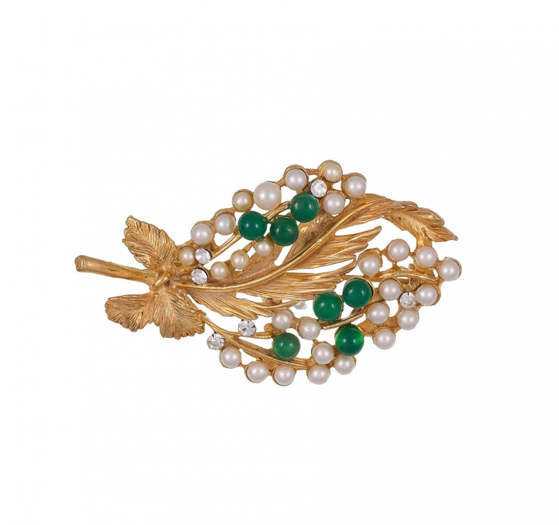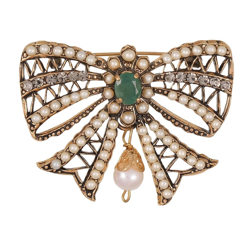 Broche en forma de lazo en plata dorada ornamentado con ágata verde central de talla oval engastado en cuatro garras y perlas cultivadas. Medidas: 4 x 5cm.