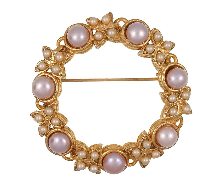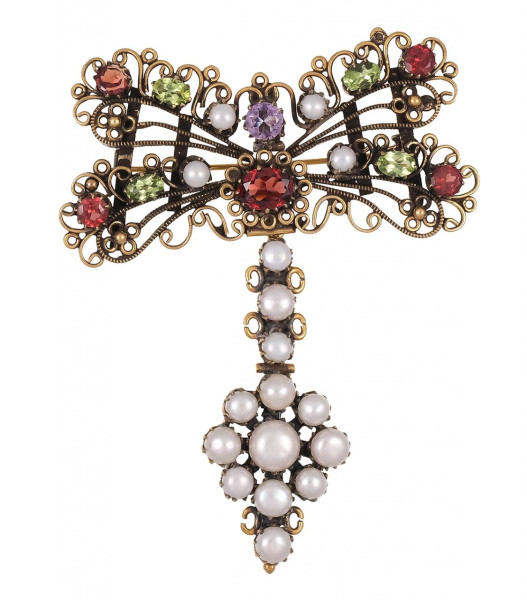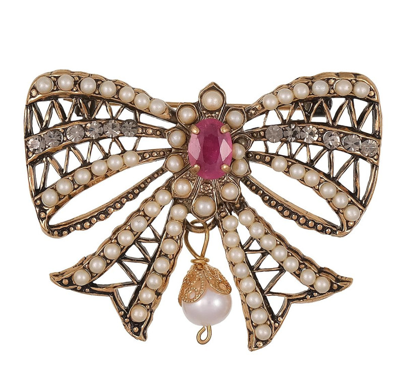 Broche en forma de lazo en plata dorada ornamentado con rubí central de talla oval engastado en cuatro garras y perlas cultivadas. Medidas: 4 x 5cm.