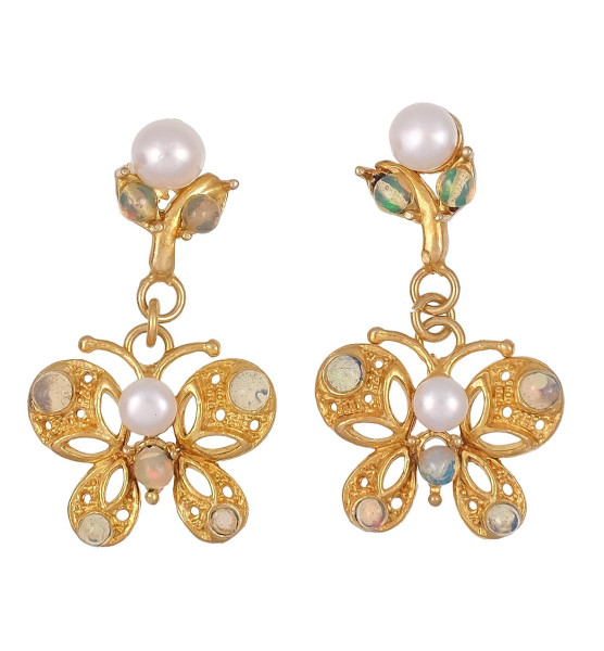 Pendientes largos en forma de mariposa ornamentados con ópalos en talla cabujón y perlas cultivadas en montura de plata dorada. Cierre presión. Largo: 3,5cm.