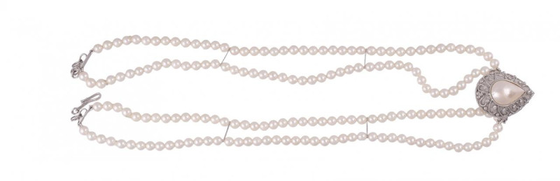 Pendientes largos en plata dorada ornamentados con cabujón central de granate y perlas cultivadas. Cierre de gancho. Largo: 4,3 cm.