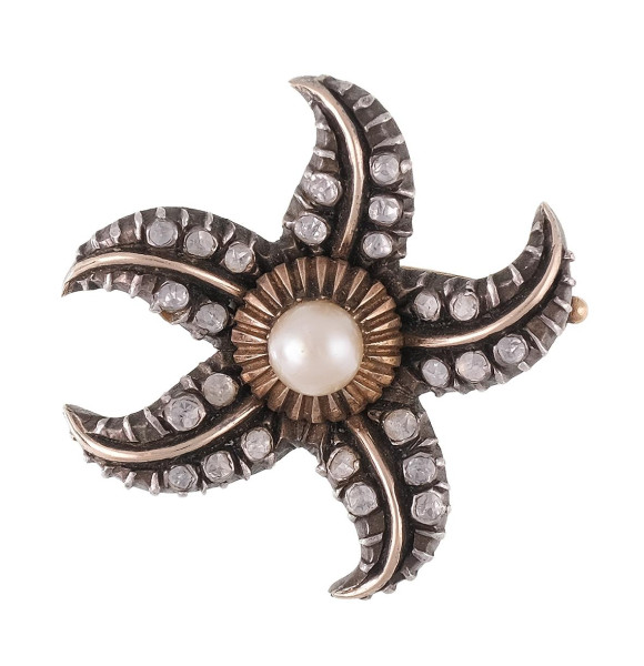 Broche antiguo en forma de estrella de mar con frente de plata con perla cultivada central y trasera de oro bajo. Medidas: 3,5 x 4cm. Peso total de la pieza: 13,55g.