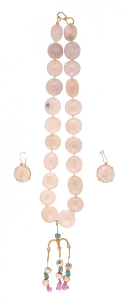Conjunto en estilo antiguo de pendientes y collar de cuentas de ágata con colgante bizantino en oro amarillo de 18k con esmeraldas y rubíes.