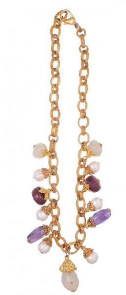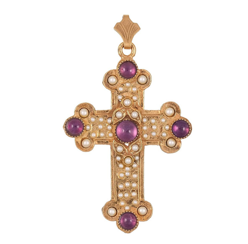Colgante en forma de cruz en plata dorada con amatistas en talla cabujón y perlas cultivadas. Medidas: 6,5 x 4cm.