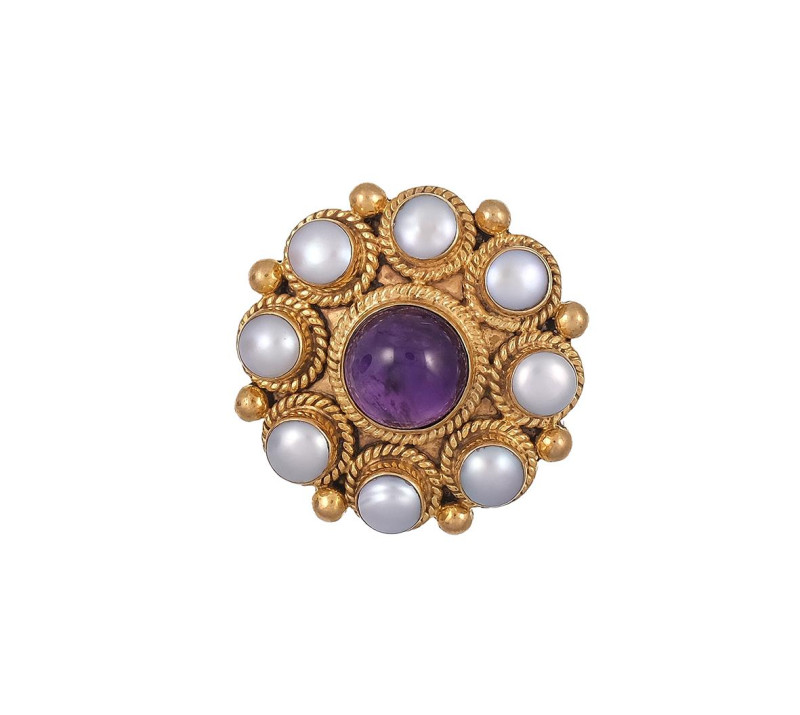 Broche en plata dorada centro con amatista en talla cabujón orlada con perlas cultivadas. Diámetro: 3cm.