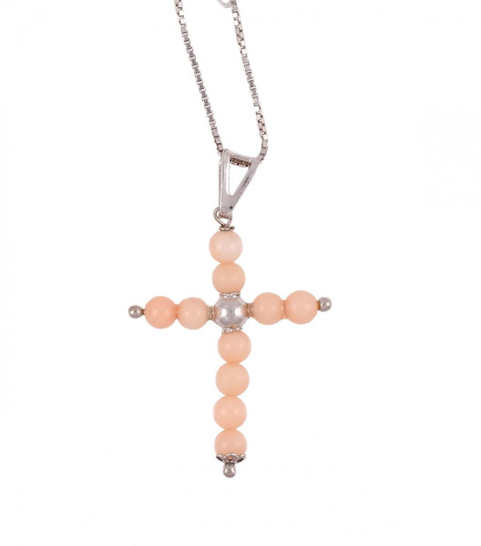 Cruz con cuentas de piel de ángel en plata y cadena de plata. Largo total: 36cm. Peso total de la pieza: 2,88g.