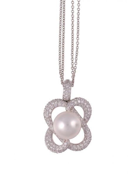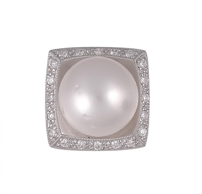 Colgante cuadrado de oro blanco con orla de brillantes de 0,21ct y perla australiana de 11,5mm de diámetro. Peso total de la pieza: 5,46g.