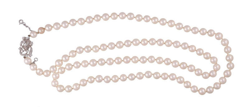 Colgante de brillantes de 2ct con perla australiana de 12mm de diámetro en cadena doble con. Largo total: 40cm. Peso total de las piezas: 15g.