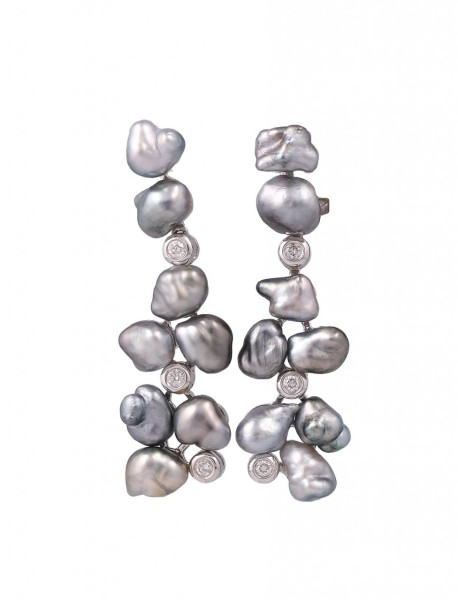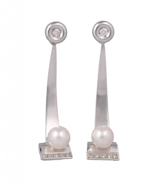 Pendientes largos en oro blanco de 18k con brillante talla diamante engastados en chatón y perlas cultivadas de 0,5mm de diámetro. Cierre a presión. Peso total de las piezas: 8,35g.
