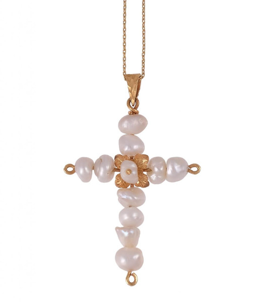 Colgante en forma de cruz con perlas biwa y hojillas en oro amarillo de 18k con cadena de oro. Largo total: 36cm. Peso total de las piezas: 4,74g.