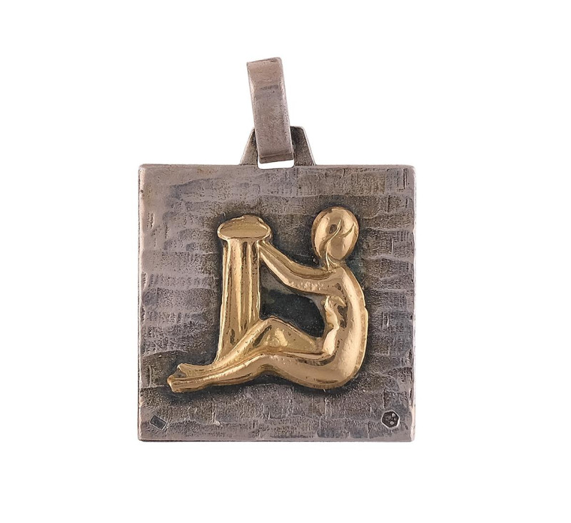Colgante cuadrado en plata con figura en oro de 18k. Dimensiones: 25 x 25mm. Peso total de la pieza: 10,3g.