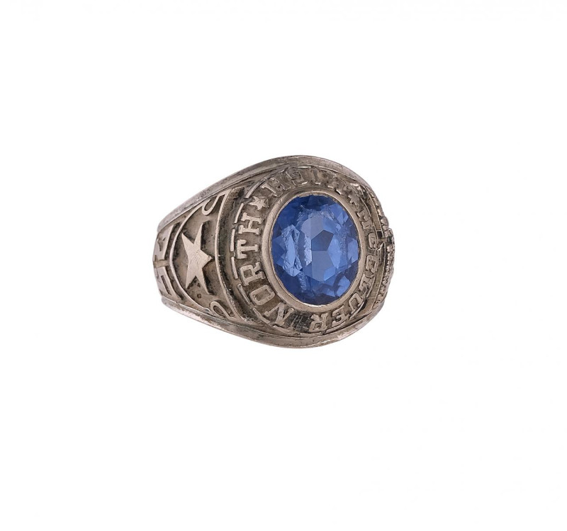 Anillo en oro blanco de 10k con cuarzo azul central, perteneciente al instituto "Mc CLUER NORTH". Peso total de la pieza: 21,25g.