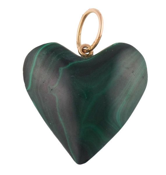 Colgante de malaquita en forma de corazón, con asa y reasa de oro amarillo de 18k. Peso total de la pieza: 20g.