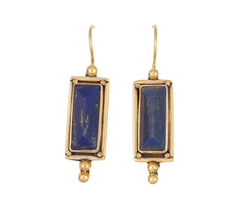 Pendientes plata dorada ornamentado con lapislázuli tallado. Cierre de gancho con seguridad. Largo: 4cm.
