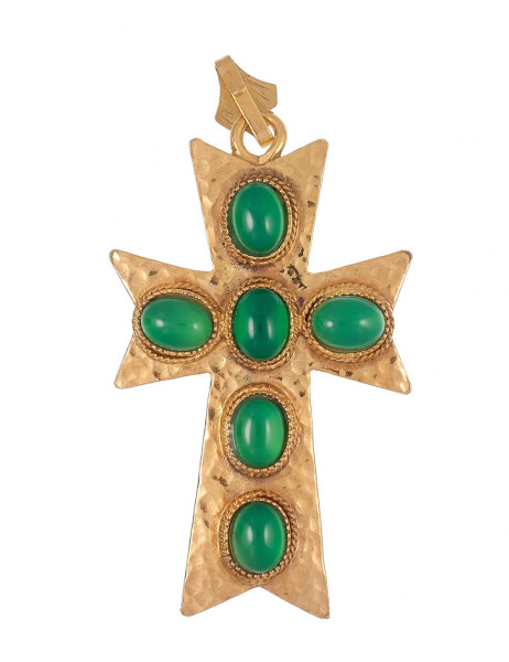 Colgante en forma de cruz en plata dorada ornamentada con ágatas verde en talla cabujón. Medidas: 7 x 3,5cm.