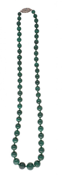 Collar con cuentas de malaquita en disminución y cierre en plata italiana. Largo total de la pieza: 70cm.