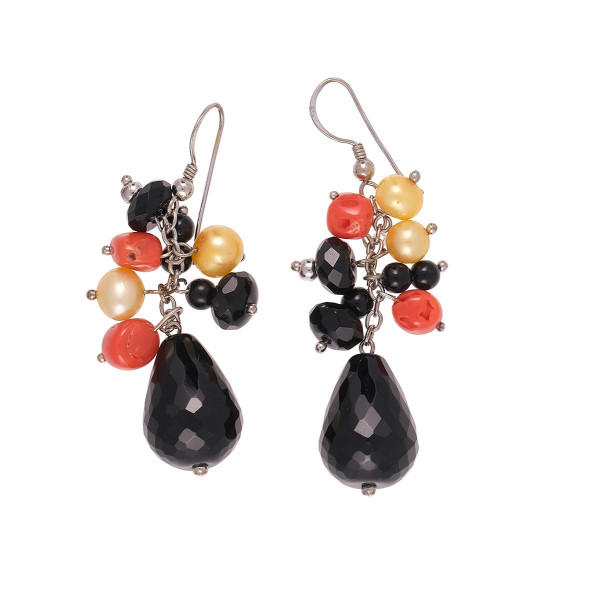 Pendientes de ónix con perlas y cuentas de coral montados en plata italiana con contraste. Largo total de la pieza: 5,5cm.