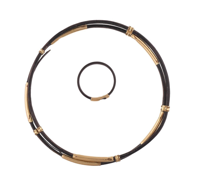 Conjunto de pulsera y anillo en pelo de elefante y oro amarillo de 18k.