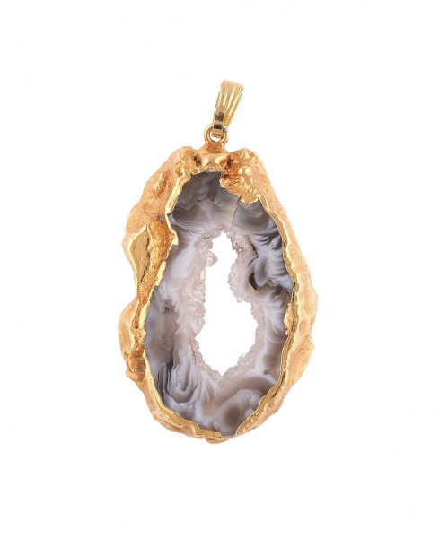 Colgante en metal dorado con lámina de geoda de cuarzo.