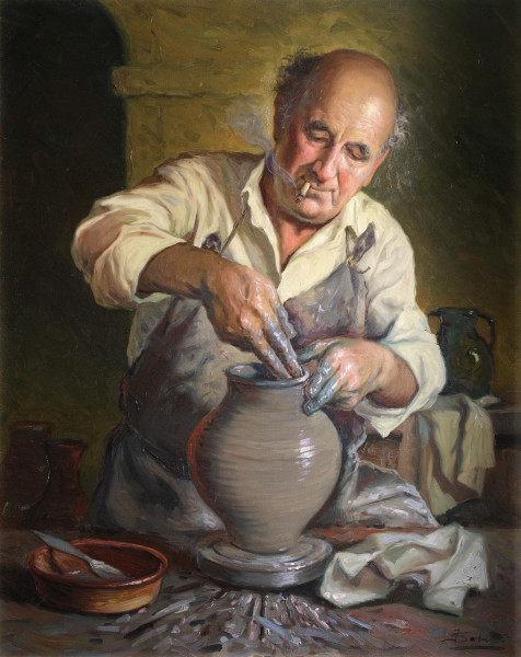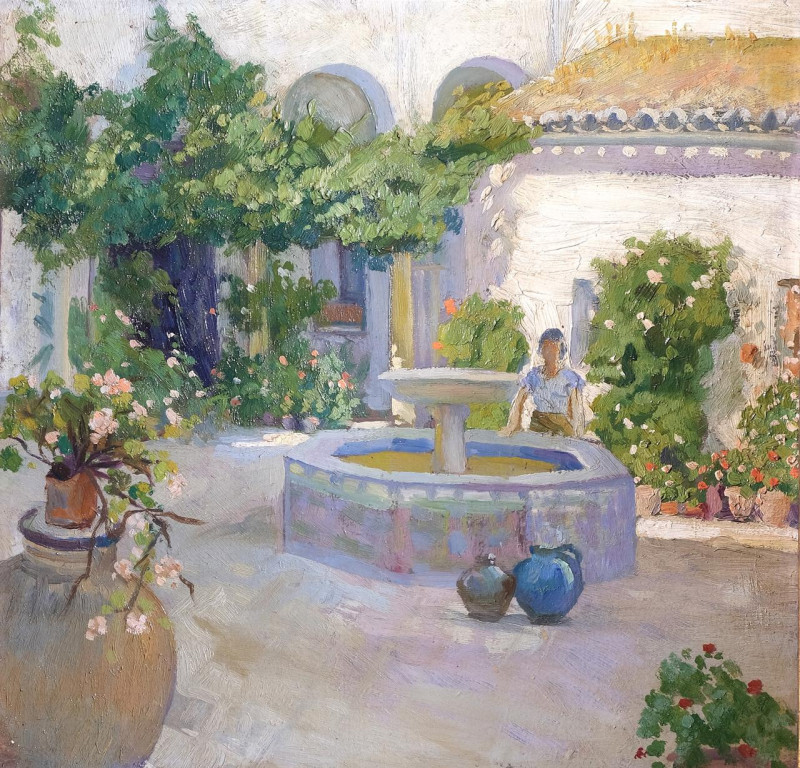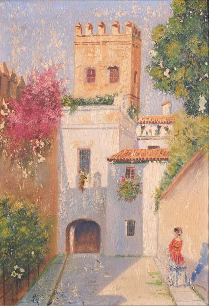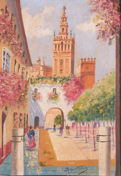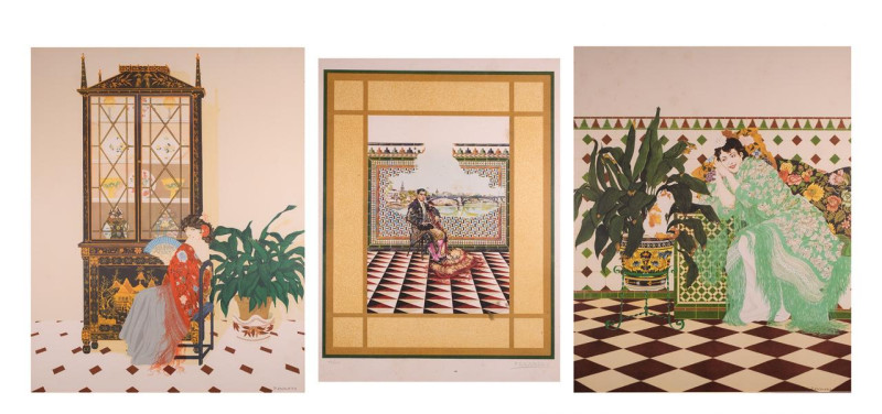 Joven con mantón y abanico, Torero con el Guadalquivir y Sevilla de fondo y Joven recostada con mantón